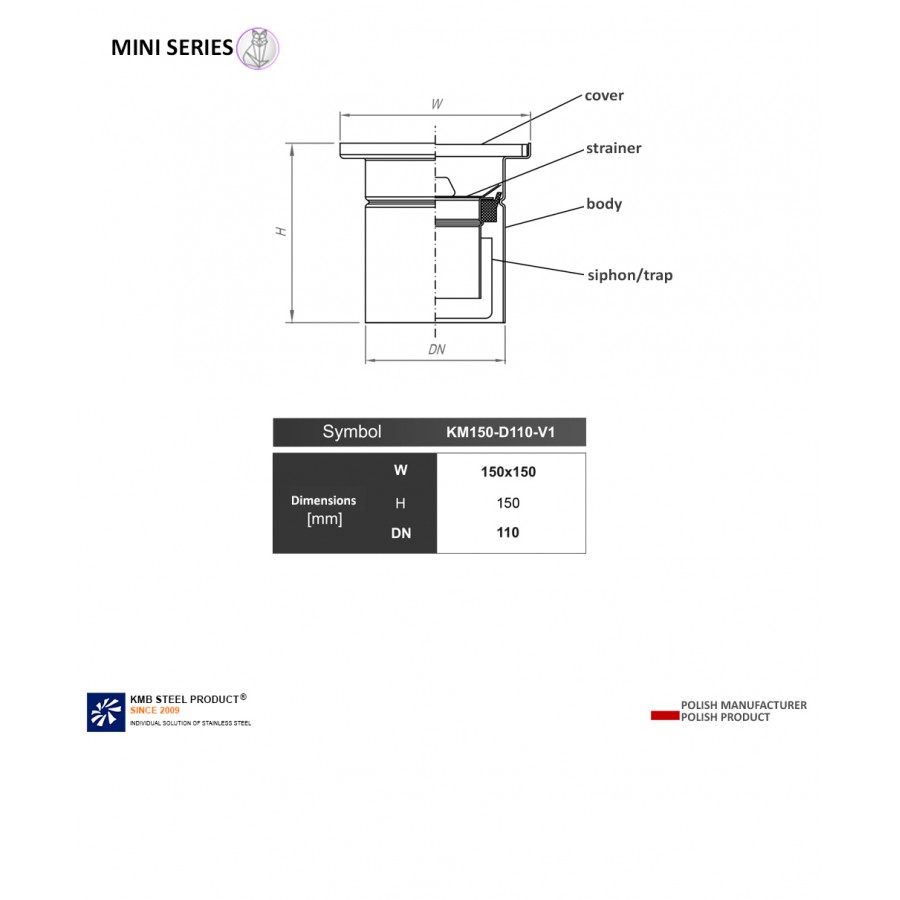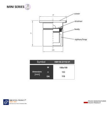 The KM150 gully means the dimension of the top of the drain 150 x 150 mm, DN110 is the drain entering the pipe with a diameter of 110, V1 is a type of drain - Vertical