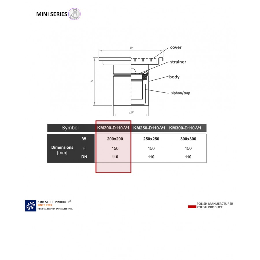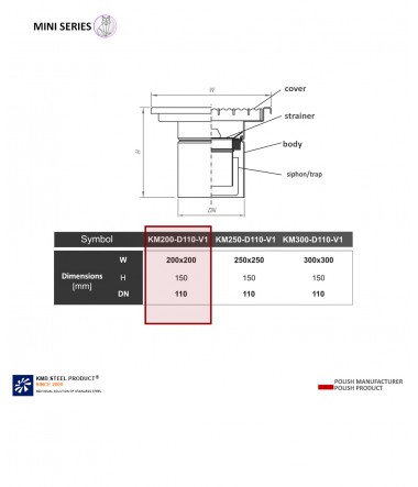 The KM200 gully means the dimension of the top of the drain 200 x 200 mm, DN110 is the drain entering the pipe with a diameter of 110, V1 is a type of drain - Vertical