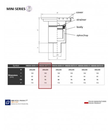 The KM200 gully means the dimension of the top of the drain 200 x 200 mm, DN075 is the drain entering the pipe with a diameter of 075, V1 is a type of drain - Vertical