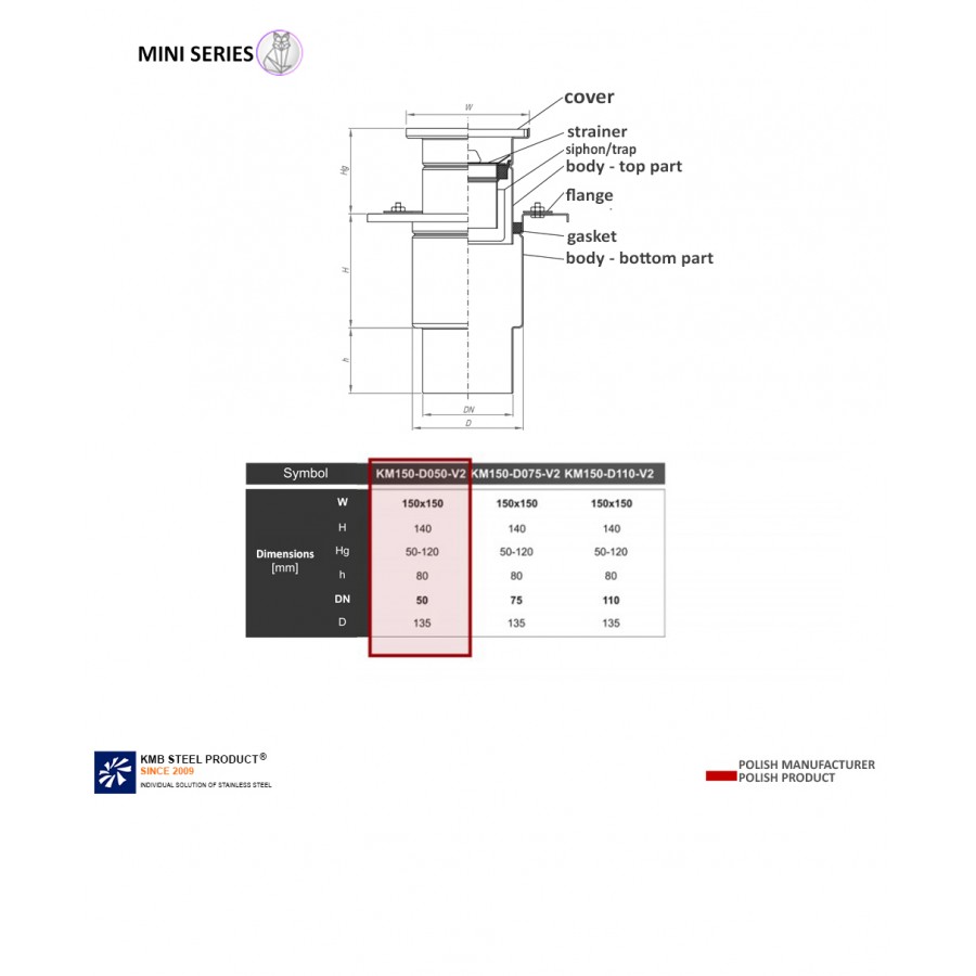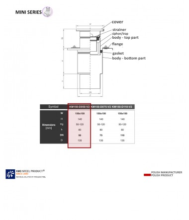 The KM150 gully means the dimension of the top of the drain 150 x 150 mm, DN050 is the drain entering the pipe with a diameter of 050, V2 is a type of drain - Vertical