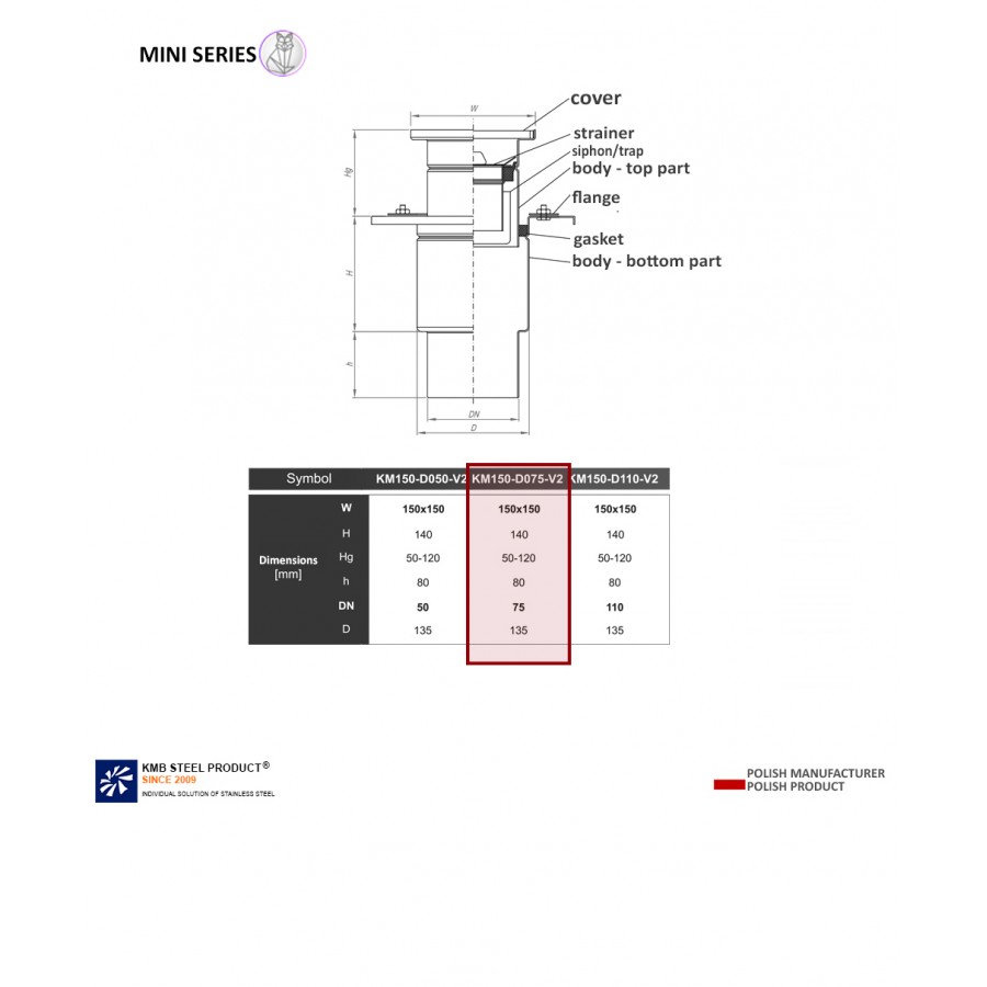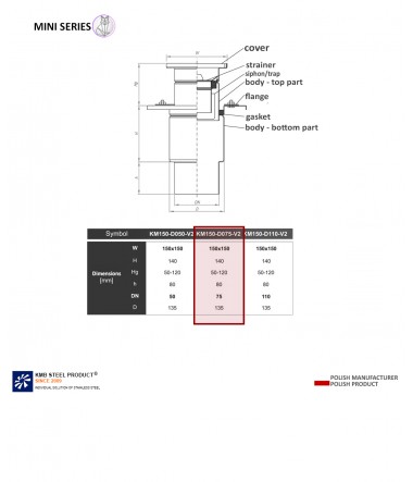 The KM150 gully means the dimension of the top of the drain 150 x 150 mm, DN075 is the drain entering the pipe with a diameter of 075, V2 is a type of drain - Vertical