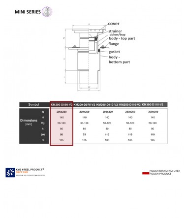 The KM200 gully means the dimension of the top of the drain 200 x 200 mm, DN050 is the drain entering the pipe with a diameter of 050, V2 is a type of drain - Vertical