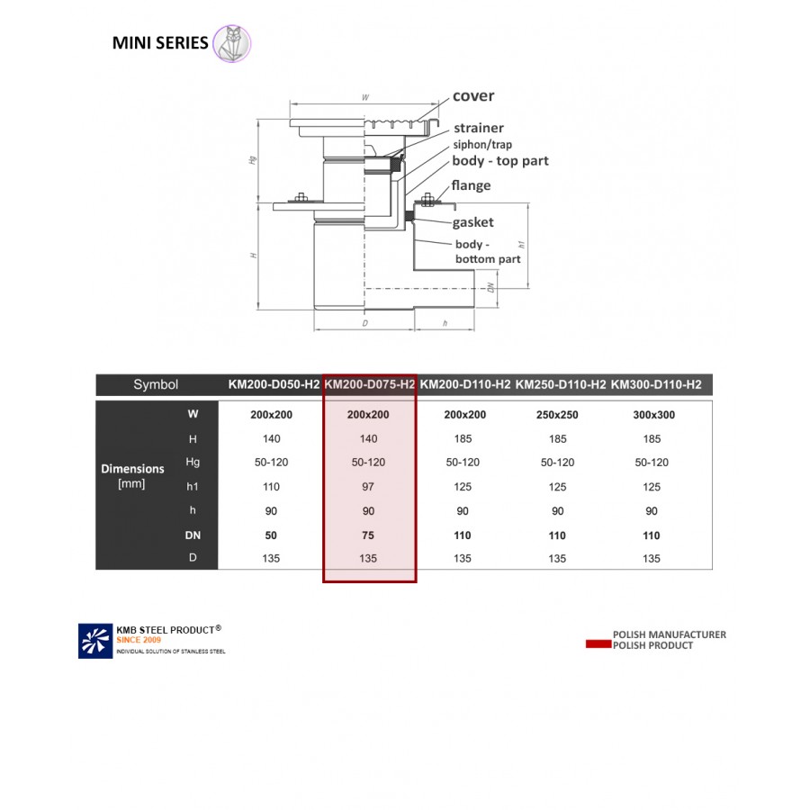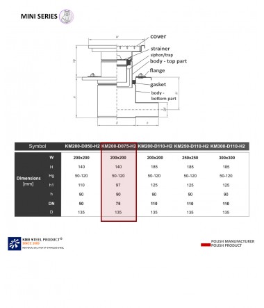 The KM200 gully means the dimension of the top of the drain 200 x 200 mm, DN075 is the drain entering the pipe with a diameter of 075, H2 is a type of drain - Horizontal