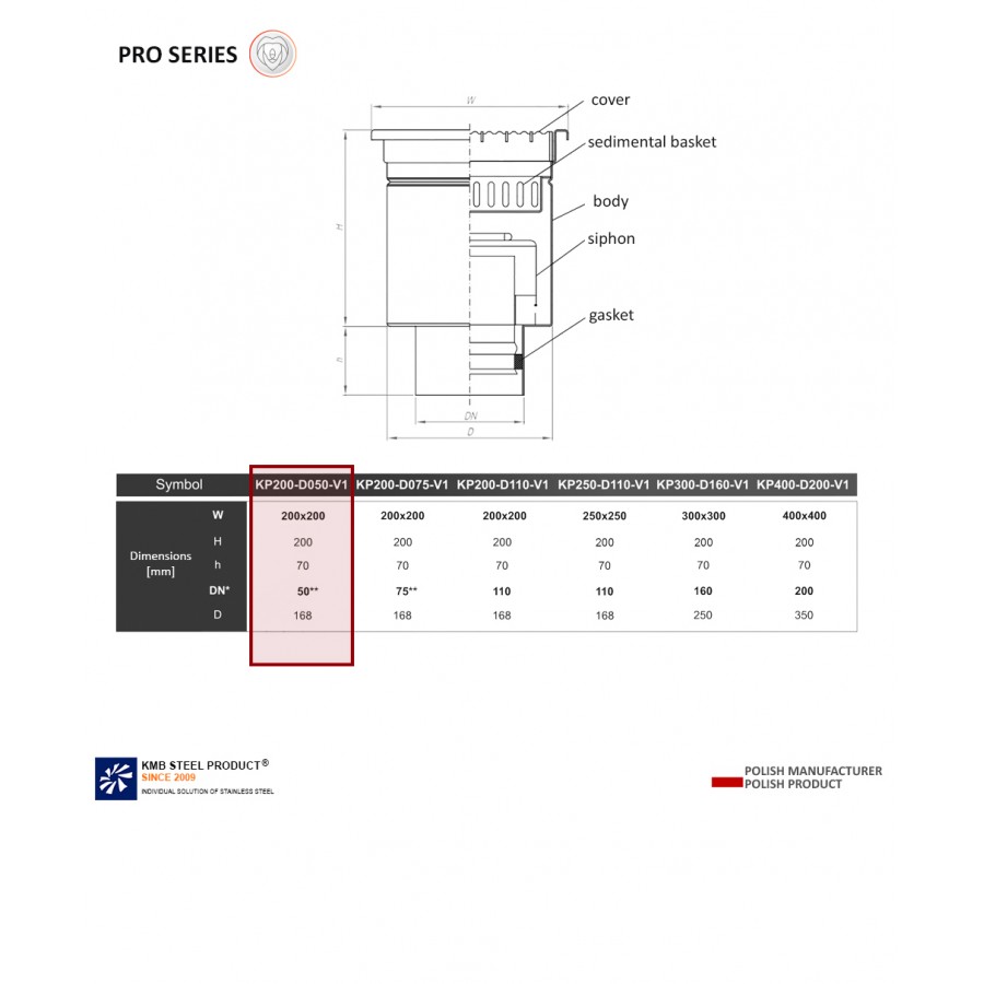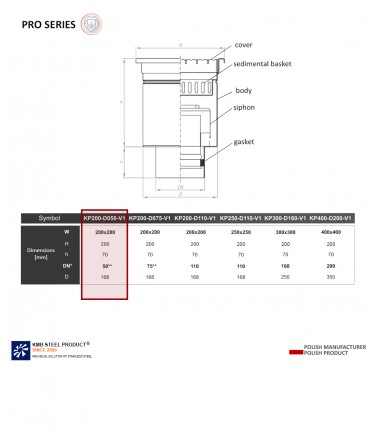 The KP200 gully means the dimension of the top of the drain 200 x 200 mm, DN050 is the drain entering the pipe with a diameter of 050, V1 is a type of drain - VERTICAL, i.e. vertical.