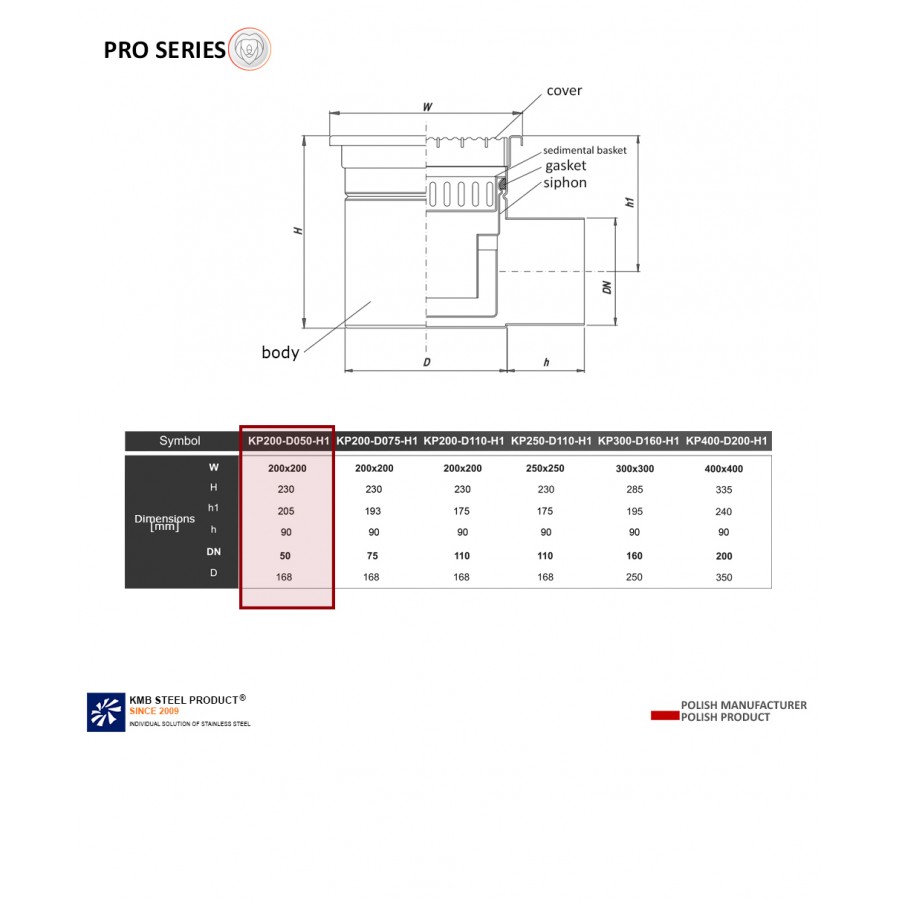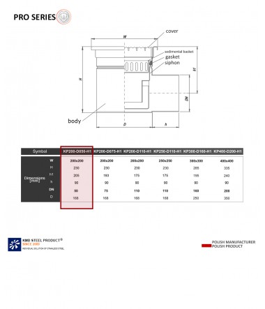 The KP200 gully means the dimension of the top of the drain 200 x 200 mm, DN050 is the drain entering the pipe with a diameter of 050, H1 is a type of drain - VERTICAL, i.e. vertical.