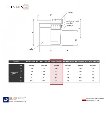 The KP250 gully means the dimension of the top of the drain 250 x 250 mm, DN110 is the drain entering the pipe with a diameter of 110, H1 is a type of drain - HORIZONTAL