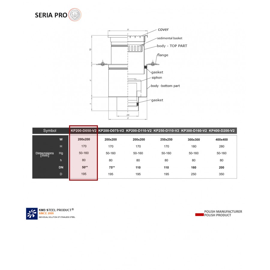 The KP200 gully means the dimension of the top of the drain 200 x 200 mm, DN050 is the drain entering the pipe with a diameter of 050, V2 is a type of drain - Vertical