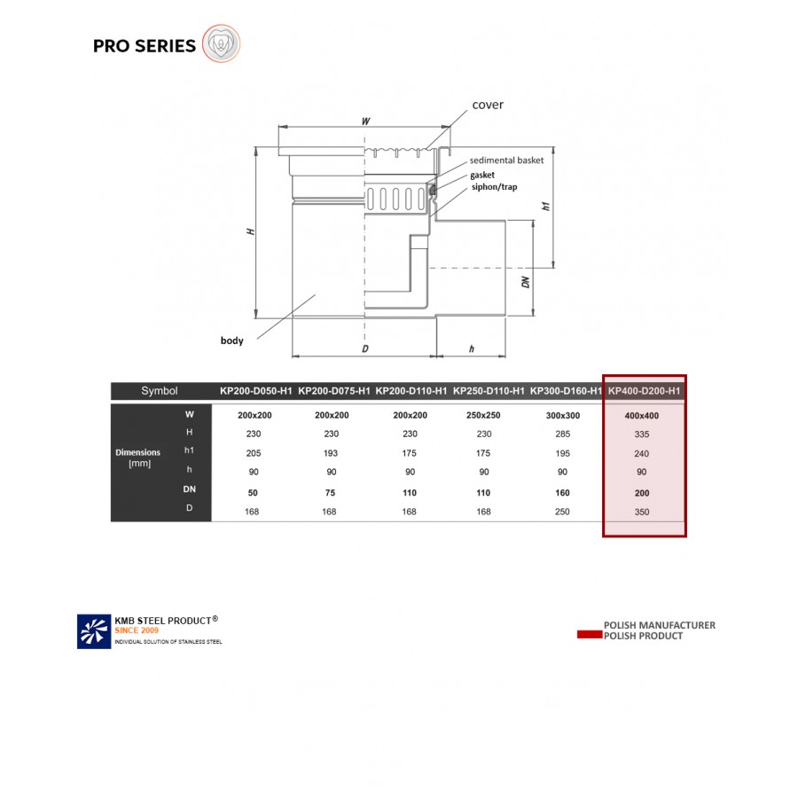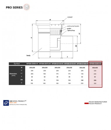 The KP400 gully means the dimension of the top of the drain 400 x 400 mm, DN200 is the drain entering the pipe with a diameter of 200, H1 is a type of drain - Horizontal